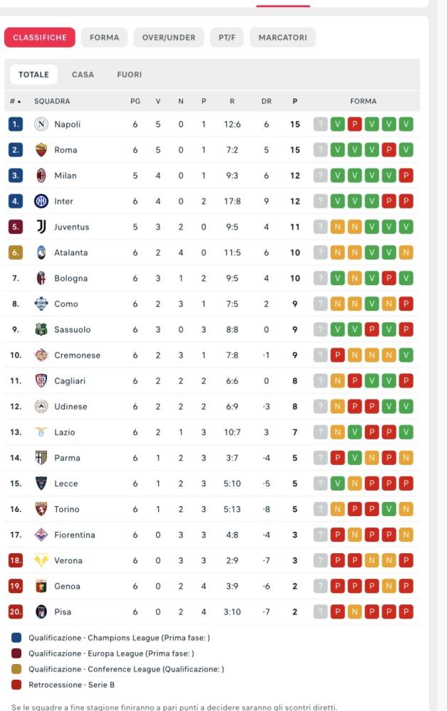 Dopo aver riscattato la sconfitta di sette giorni fa a San Siro contro il Milan già in Champions League, battendo lo Sporting, il Napoli torna al successo anche in campionato e completa la sua bella settimana con una vittoria in rimonta sul Genoa. Rossoblù battuti 2-1 e testa della classifica riconquistata in condominio con la Roma di Gasperini a 15 punti. Di seguito la classifica di Serie A aggiornata.