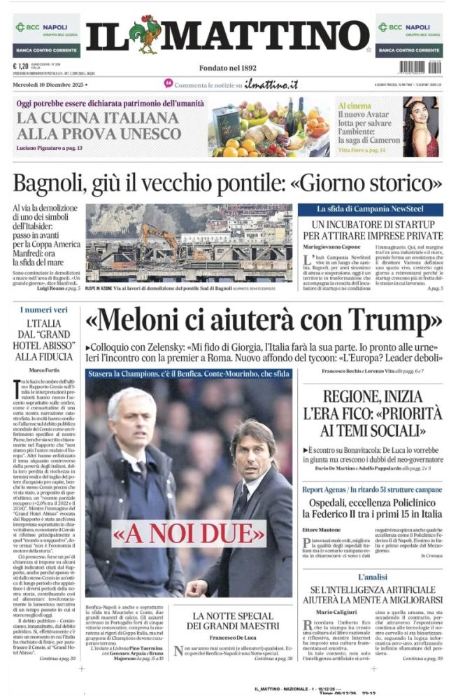 “A noi due“, apre così in prima pagina Il Mattino nell’edizione odierna, presentando il duello a distanza tra Antonio Conte e José Mourinho nel match di oggi alle ore 21:00. Il sommario: “Stasera la Champions, c’è il Benfica. Conte-Mourinho, che sfida“. Di seguito la prima pagina integrale.