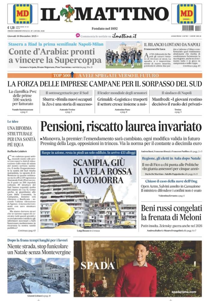 “Conte d’Arabia, pronti a vincere la Supercoppa“, scrive così in prima pagina Il Mattino nell’edizione odierna, presentando il match che stasera attende gli azzurri contro i rossoneri, in palio ci sarà la qualificazione alla finale del torneo. Il sommario: “Stasera a Riad la prima semifinale Napoli-Milan“. Di seguito la prima pagina integrale.
