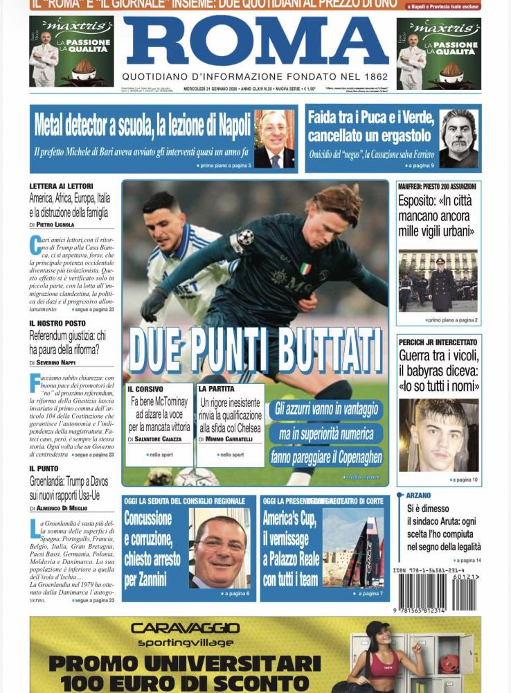 “Due punti buttati“, apre così Il Roma nella prima pagina odierna, commentando il deludente passo falso del Napoli in Champions League. Il sommario: “Gli azzurri vanno in vantaggio, ma in superiorità numerica fanno pareggiare il Copenhagen“. Di seguito la prima pagina integrale.