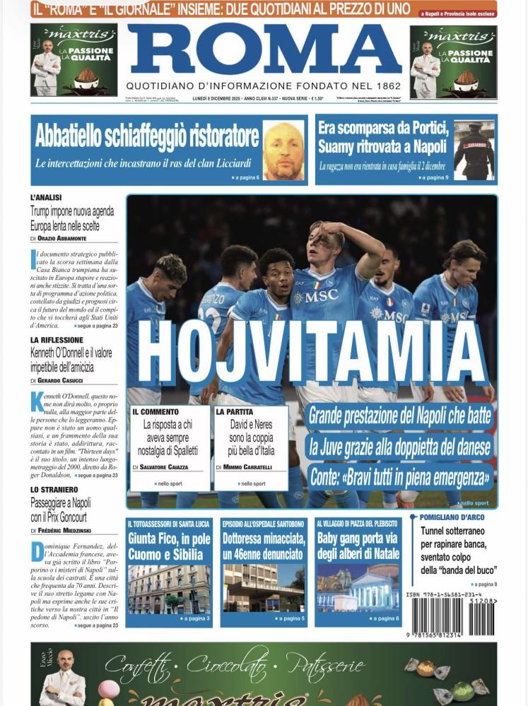 Nell’edizione di oggi, Il Roma dedica l’apertura in prima pagina con il Napoli che stende la Juventus grazie ad un doppietta di Rasmus Hojlund: “Grande prestazione del Napoli che batte la Juve grazie alla doppietta del danese. Conte: ‘Bravi tutti in piena emergenza‘”. Di seguito la prima pagina integrale.
