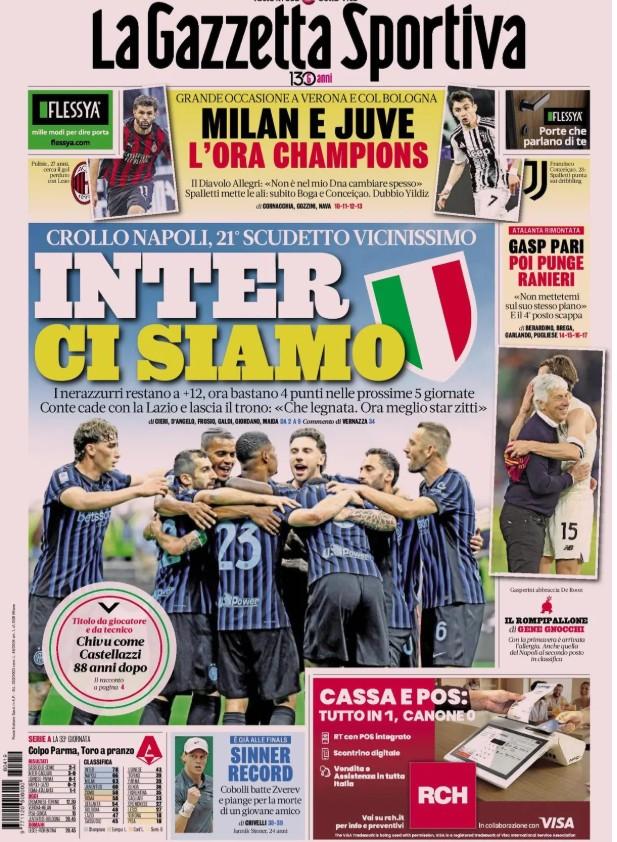 “Inter, ci siamo”. Questo il titolo in prima pagina dell’edizione odierna della Gazzetta dello Sport. Il riferimento è alla formazione di Cristian Chivu che è davvero ad un passo dalla conquista dello scudetto. Il Napoli ieri infatti è stato sconfitto per 2-0 in casa della Lazio e adesso il divario fra le due formazioni è di 12 punti quando mancano cinque giornate alla fine del campionato.